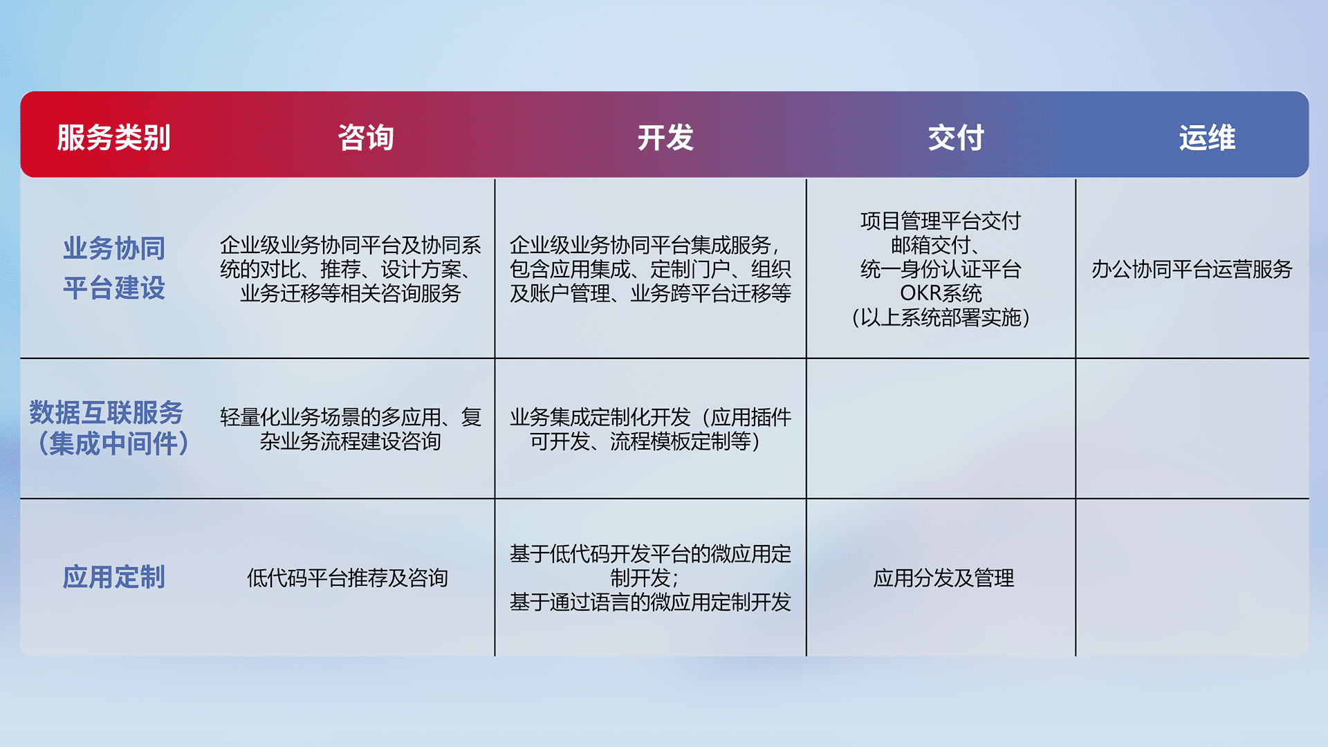 针对钉钉、、企微、、、、IDaas等平台级产品提供产品的规划、、、方案、、、交付、、、、定制化开发等服务,,,实现如统一协同办公、、、智能客户服务、、混合会议管理、、、智能数据查询、、、、等业务场景,,实现数字化转型。。。